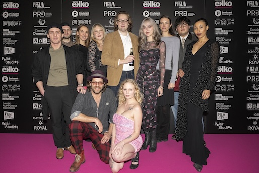 Vinderen af prisen for bedste dokumentar blev den færøske queer-fortælling Vælkomin heim af Maria Winther Olsen (nummer to fra venstre). Hun ledsages af hovedpersonerne Álvur av Kák og Anna Sofia Skoradal (nummer tre og to fra højre), producer Emilia Moth (i midten) og klipperen Caja Trier (nummer tre fra venstre). Yderst til venstre står fotograf Sophus Wolf og yderst til højre tonemester Rasmus Meyer.