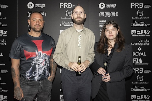 Den lille genistreg af en kortfilm, Service Bus fra The Animation Workshop i Viborg, vandt prisen for bedste animation. I dobbelttern står instruktøren Elmer Lødemel sammen med (fra venstre) storyboard og fx-animatoren Lea My Ib, producer Niels Gram Riisgaard og animator Matthew Ponquett.