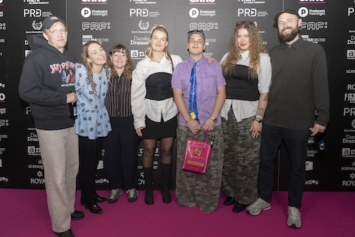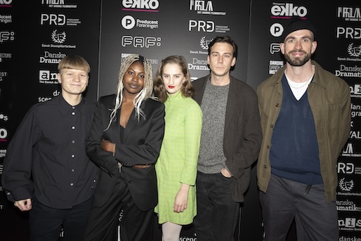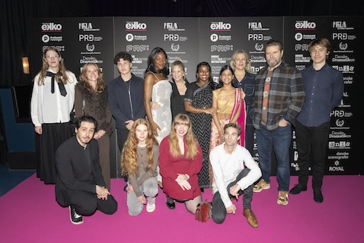 Etniske Smerter var nomineret til hele fire priser, så Bremen Teater fik besøg af et stort hold. Heriblandt instruktør Nivetha Balasubramaniam (nummer fem fra højre), skuespiller Peter Gantzler (nummer to fra højre), manuskriptforfatter Diêm Camille (nummer fire fra venstre) og producer Katrine Dolmer (på hug i midten).