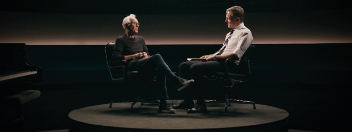 Selv er han klædt i sneakers og en tætsiddende, sort sweater. Han virker uimponeret over at skulle møde den uforudsigelige tv-vært i et mørkt studie, hvor kun to stole, computerstyrede kameraer og et Steinway-flygel står klart.