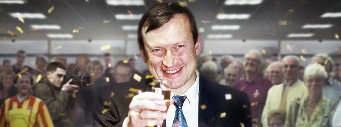Han stikker samtlige børn i byen en hjemmecomputer, han inviterer alle byens pensionister på charterrejser, og han sidder – ved Gud! – og siger, at en ny storklub i Nordsjælland kan komme på fodboldens landkort, ja, Farum kan da komme i Champions League, hvis det skal være.