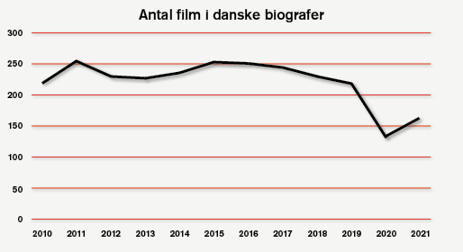 2021 blev en smule bedre end 2020, men langt fra normalen. Her blev der udsendt 162 film, hvilket svarer til en stigning på 24 procent i forhold til 2020.