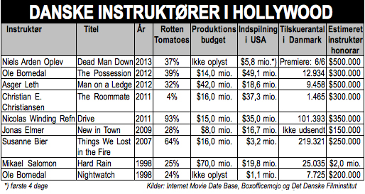 Af de ni Hollywood-film, som danske instruktører har stået bag siden 1998, har kun en enkelt formået at blive en succes både i billetlugerne og blandt de amerikanske anmeldere: Nicolas Winding Refns Drive, der indspillede pæne 35 millioner dollars i USA og fik 93 procent positive vurderinger blandt de anmeldelser, sitet Rotten Tomatoes samler sammen.