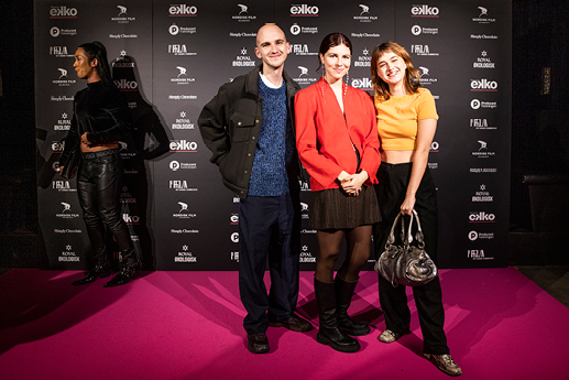 Skuespillerne Anton Hjejle og Frederikke Dahl Hansen flankerer Marta Holm, der løb med prisen for bedste kvindelige skuespiller. I baggrunden interviewes Sy Lee, der også er mødt op for at hylde de filmiske talenter.
