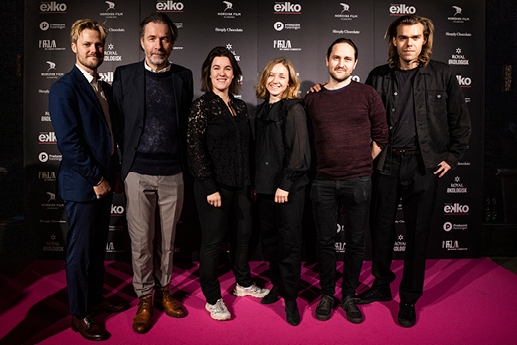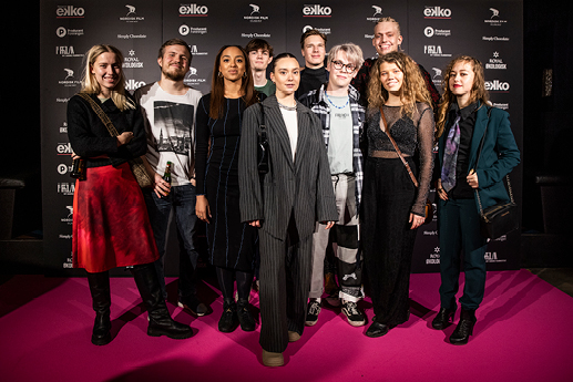 Holdet bag Filmskole-afgangsfilmen Frie mænd er mødt talstærkt op på den røde løber med instruktør Óskar Kristinn Vignisson i centrum med sort blazer. Fra venstre er han omgivet af Diana Queirós – som vandt for filmens lyddesign – Christian Karlsen, Juan Eduardo Becerra Bastias, Mie Sofie Nielsen, Søs Thøstesen, Anton Hjejle, Signe Borrevang, Martha Lieberath Mørk og Signe Krab Nymann.