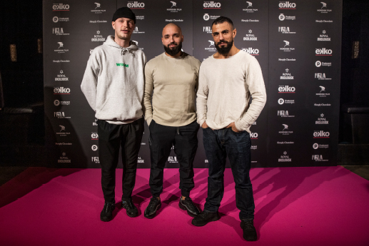 Bokseringen er skiftet ud med den røde løber for den tidligere verdensmester i kampsporten MMA, Rhassan Muhareb (th.), der var nomineret for sit skuespil i Partisan. Han får selskab af manuskriptforfatteren Frederik Rye Nielsen (tv.) og instruktørtalentet Jahfar Muataz, der også var nomineret for den hårdtslående film.