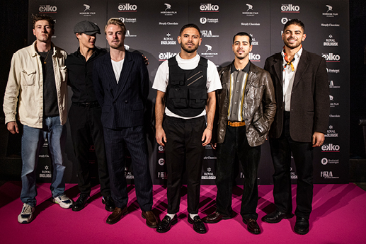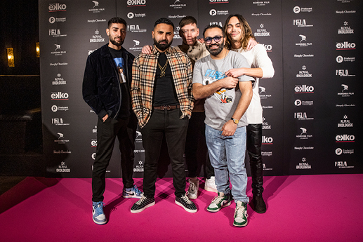 Filmskaberne bag den nominerede Tornen dør, blomsten lever har et helt følge af venner med sig til showet. Og der udbryder et jubelbrøl fra deres pladser i salen, da en scene fra filmen bliver vist på lærredet i salen. Fra venstre står Oliver Jacoby, Tobias Kjær Nielsen, instruktør Mikkel Husted Mørup, manuskriptforfatter og skuespiller Sammy Germain Wadi, Hashim Musa Jr. og Adam Mustafa.
