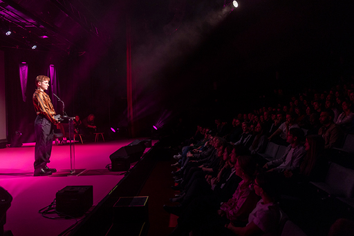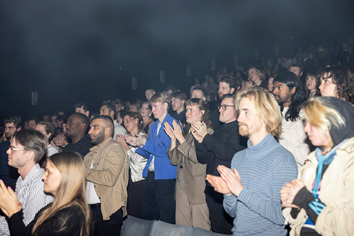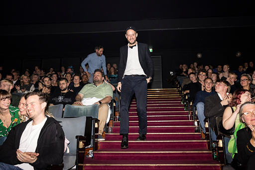 Den fyldte sal set fra værternes synsvinkel. Unge og ældre, branchefolk og filmfans, fejrede landets største filmtalenter og de bedste kortfilm, som i det forgangne år er kommet på onlinehitlisten Ekko Shortlist.