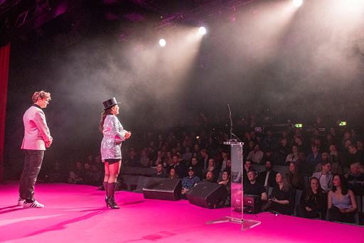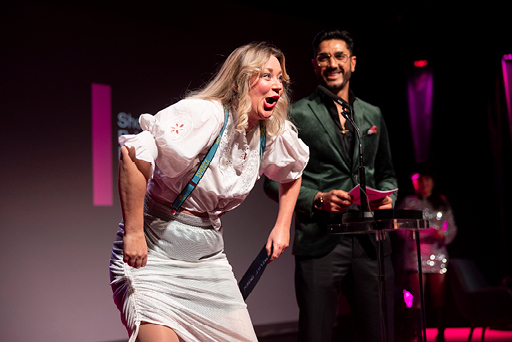 Animationsinstruktøren Sabine Ravn og skuespilleren Afshin Firouzi var som medlemmer af juryen mødt op for at uddele Shortlist Prisen. De havde god kemi og vakte latter med en underholdende optræden.