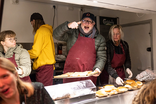 Den evige provokatør Peter Aalbæk Jensen havde valgt at iføre sig en DF-kasket, da den garvede producer vanen tro serverede natmad fra sin pølsevogn.
