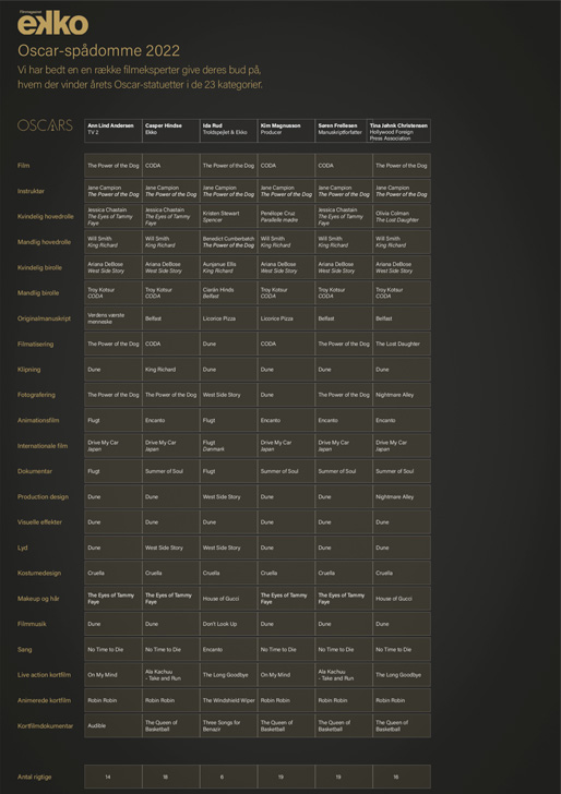 Casper Hindse – der har vundet fire gange i de seneste fem år – tegner sig i år for atten rigtige gæt. Han ramte rigtigt i alle skuespil- og manuskriptkategorierne, men havde ikke forudset, at Dune ville løbe med snart sagt samtlige tekniske priser for blandt andet fotografering og klipning.