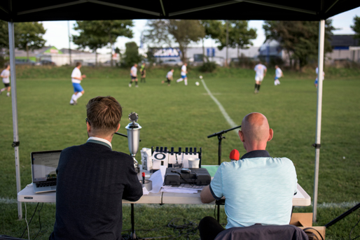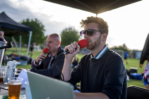Med solskin i ryggen og glimt i øjet dækker kommentatorerne slaget i de indledende minutter af kvartfinalekampen mellem Zentropa og Profile Pictures.