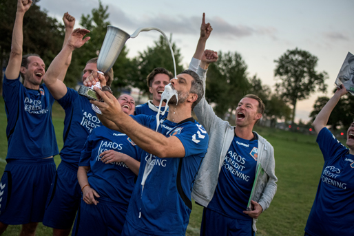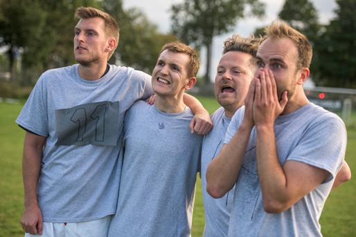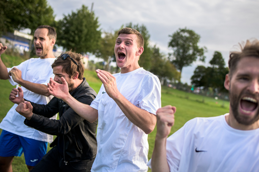 "Der er mange ting i livet, der er vigtigere end fodbold, men lige nu føles det ikke sådan!” Oliver Zahle (yderst th.) og Christian Potalivo i front kan ikke holde sig fra banen, da Miso Film banker Zentropa i semifinalen.