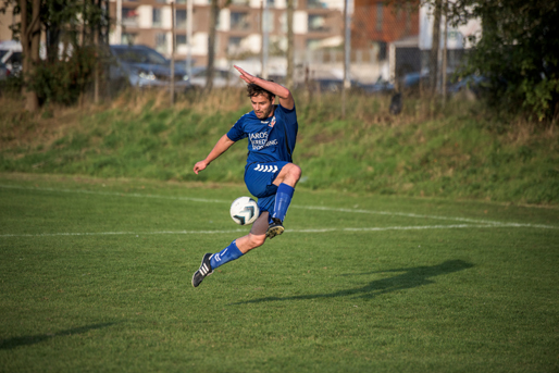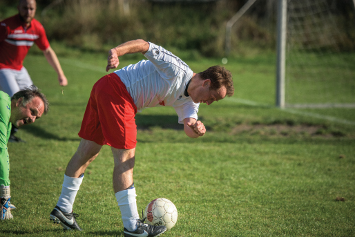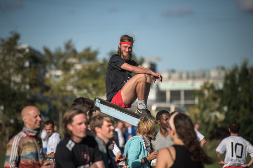 Turneringens store profil, skuespilleren Niklas Herskind, leverer fodbold-akrobatik i Miso Films kvartfinale mod Team Players. Han ville gøre sig godt i Den Kongelige Ballet.