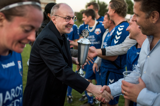 Ekkos chefredaktør Claus Christensen overrækker, som en anden mafiøs FIFA-formand, den eftertragtede vandrepokal til de stolte vindere fra Miso Film.