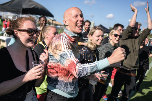 Der er opbakning fra sidelinjen, hvor tilskuerne er mødt talstærkt op for at støtte venner og kolleger i marken – godt hjulpet på vej af det gode vejr og den gratis øl.