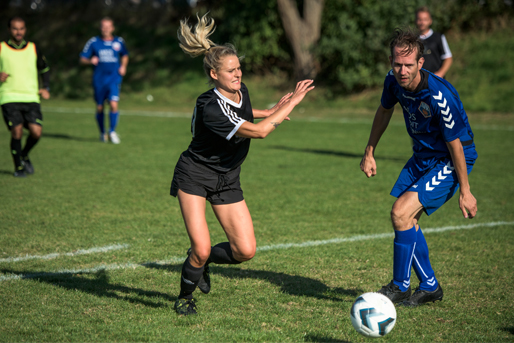 Radio24syv-værten Ida Herskind fra Wingman-holdet forsøger sig med en tigerefterligning for at skræmme Miso Films Jan Martinsen væk fra bolden.