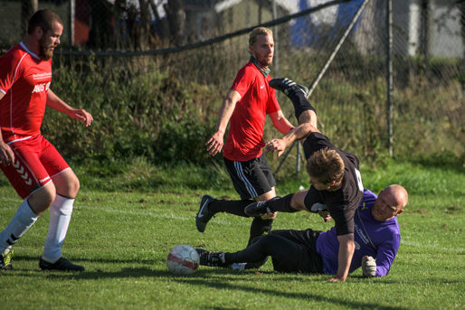 Skuespiller David Owe fra Team Players laver en flyvende takling og kolliderer med målmand Stefan Garfield i vild kamp om bolden mod Den Danske Filmskole.