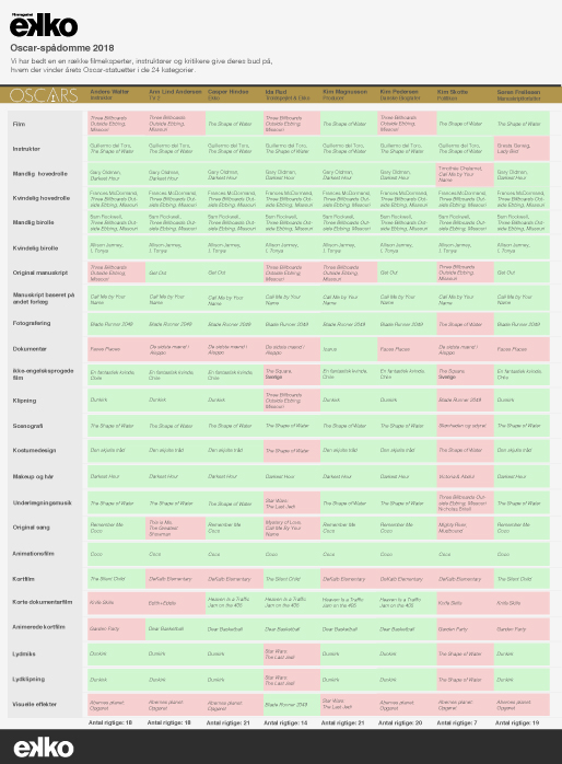 Atten rigtige fik også Oscar-ekspert på TV 2’s udsendelse, Ann Lind Andersen, der ligeledes satsede på Three Billboards Outside Ebbing, Missouri som bedste film. Ligesom halvdelen af panelet havde hun skudt på danskproducerede De sidste mænd i Aleppo som vinder af bedste dokumentar, men den gik til amerikanske Icarus – hvilket kun Kim Magnusson forudså.
