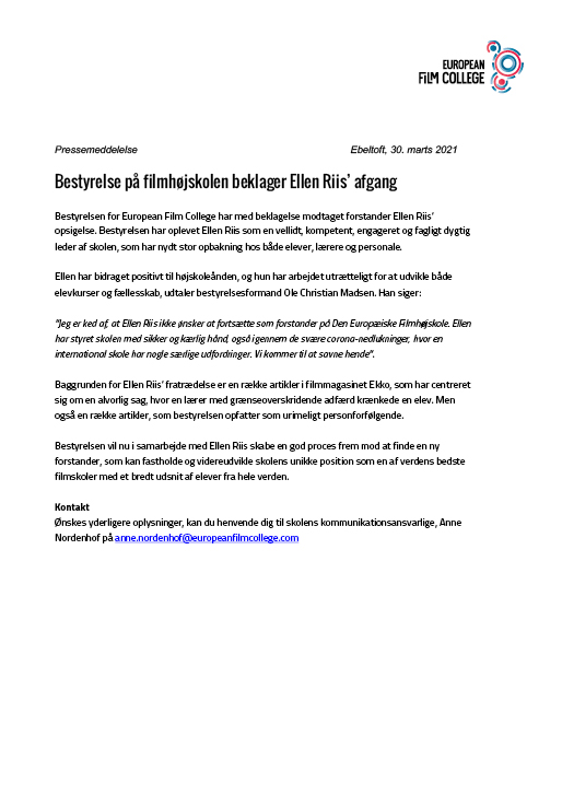 Ellen Riis annoncerede den 26. marts, at hun til sommer stopper som forstander på European Film College.