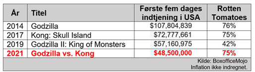 Godzilla fra 2014 indtjente 107,8 millioner dollars – små 680 millioner kroner – i amerikanske biografer de første fem dage. Imens var tallet for samme periode omkring 460 millioner kroner (72 millioner dollars) for opfølgeren Kong: Skull Island fra 2017.