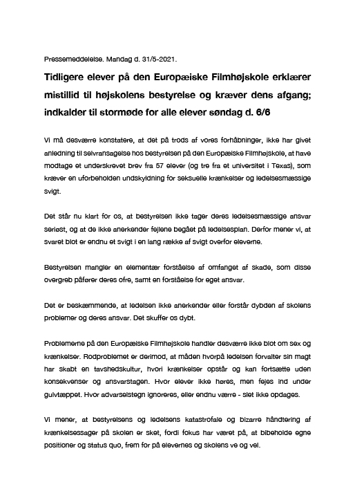 ”Problemerne på Den Europæiske Filmhøjskole handler desværre ikke blot om sex og krænkelser,” lyder det i pressemeddelelsen.