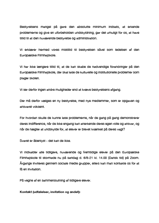 ”Vi har ikke længere tillid til, at de kan skabe de nødvendige forandringer på Den Europæiske Filmhøjskole, der skal løse de kulturelle og institutionelle problemer, som plager skolen.”