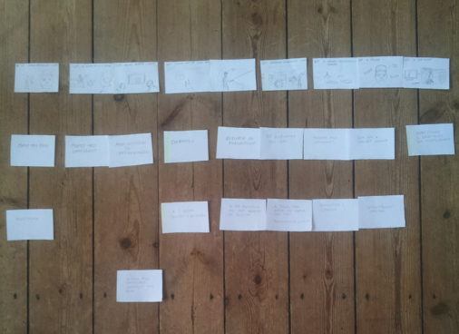 Jeg brugte såkaldte 3x5-kort – små sedler med scenebeskrivelser som hjælpemiddel. Ved at organisere dem ud over gulvet kunne jeg ane filmens overordnede struktur.