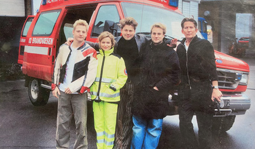 Det danske filmhold under optagelserne af Ambulancen tæller fra venstre: Paw Henriksen, Helle Fagralid, Laurits Munch-Petersen, Tomas Radoor og Thomas Bo Larsen (foto: Nordisk Film).