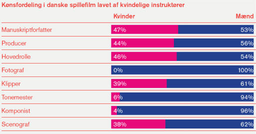 Af de mest fremtrædende roller på et filmhold er kun producerposten nogenlunde ligeligt fordelt med 56 % mænd og 44 % kvinder.