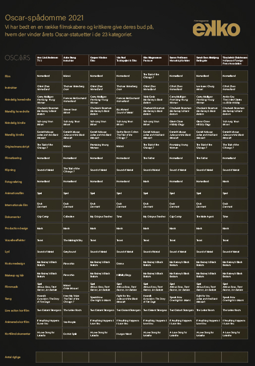 De får hård konkurrence af TV 2’s Oscar-ekspert Ann Lind Andersen, der sejrede med flest rigtige gæt i 2019, og Ekkos ekspert Casper Hindse, der løb med sejren sidste år.