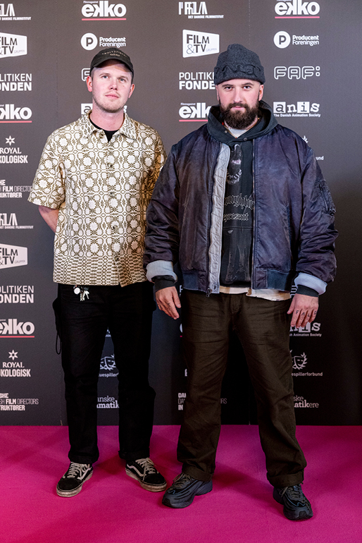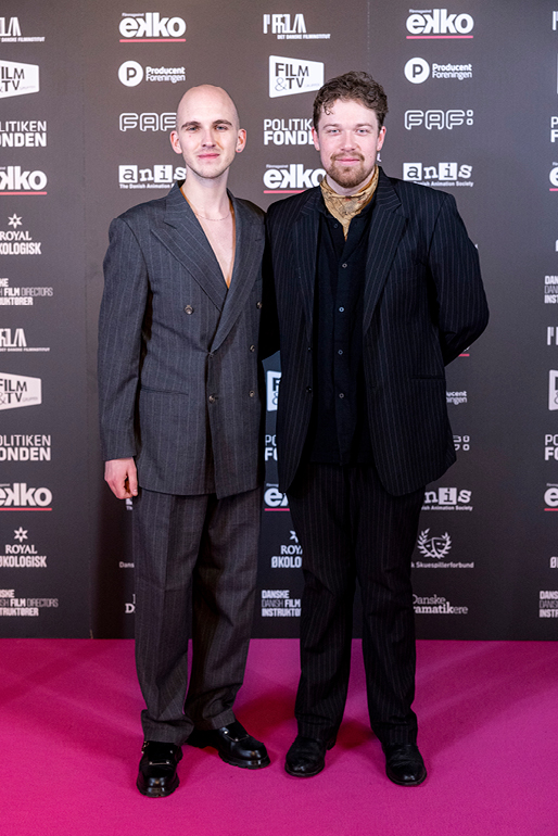 Anton Hjejle (tv.) var nomineret som bedste mandlige skuespiller for sin psykopatiske rolle i Så længe vi ikke snakker om det. Skuespilleren slog et smut forbi den røde løber med filmens instruktør August Aabo.