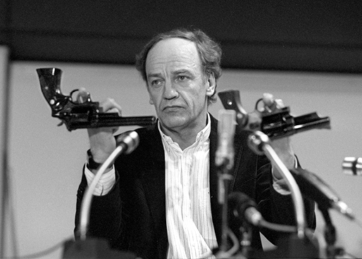 Den karismatiske efterforskningsleder Hans Holmér elskede rampelyset og vifter her under en pressekonference med det formodede mordvåben, som er mest kendt fra westerns (foto: Lars Hedberg).