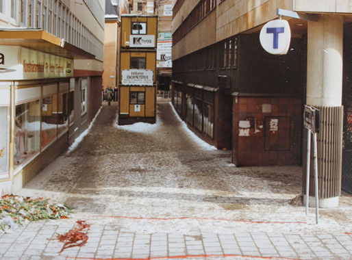 Efter at have skudt Olof Palme løb drabsmanden ned ad Tunnelgatan og forbi en barak, hvor han passerede nøglevidnet Lars Jeppsson, der for nyligt igen blev afhørt af politiet (foto: Sveriges Politi).