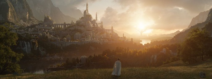 På billedet ses en kvinde bagfra i et dramatisk bjerglandskab. Det vidner om, at æstetikken og scenografien fra de tidligere film er bevaret i serien. Ligeledes er serien blevet indspillet i New Zealand, så fans kan se frem til et gensyn med de majestætiske landskaber.
