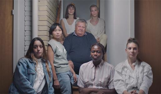 Signes far sidder sammen med barnepigerne, som spilles af skuespillere, der har samme alder og er klædt ud som de virkelige barnepiger i 1980’erne.
