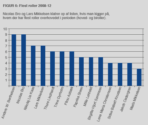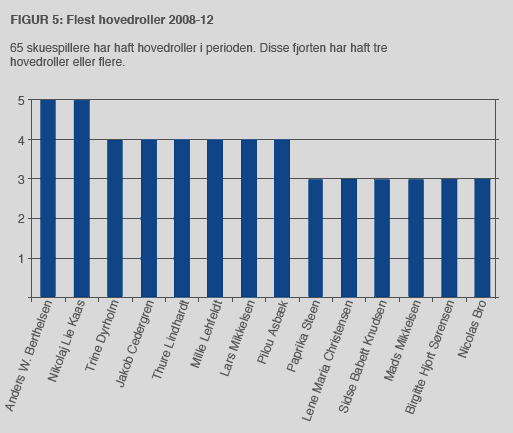 De to mest dominerende skuespillere de seneste fem år er Anders W. Berthelsen og Nikolaj Lie Kaas med fem hovedroller hver. Thure Lindhardt, Jakob Cedergren, Trine Dyrholm, Lars Mikkelsen og Mille Lehfeldt følger lige efter med fire hovedroller hver (figur 5).