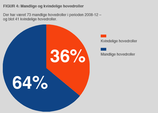 Det hører med til historien, at mens mændene har haft 73 hovedroller på de fem år, har kvinderne kun haft 41 (figur 4). Det er hele 44 procent færre.