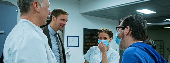 Over for ham står Lars Mikkelsens vege overlæge Pontoppidan og Nikolaj Lie Kaas’ bryske hjernekirurg Naver. Sidstnævnte farer i flint for et godt ord og kommer med skønt tvetydige trusler, når han da ikke griber en teske og, som Pontoppidan forskrækket siger på vej ud af rummet, ”gør det med øjet”.