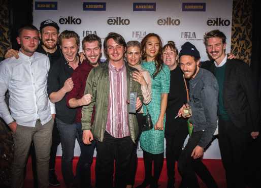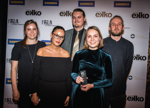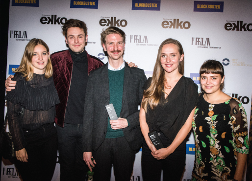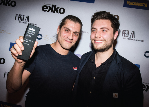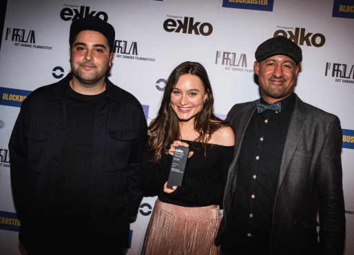 Aske Bang (i midten) er blevet kaldt kongen af Ekko Shortlist, og det levede han op til på den store aften, hvor han sammen med holdet bag Den fremmede modtog Publikum Prisen.