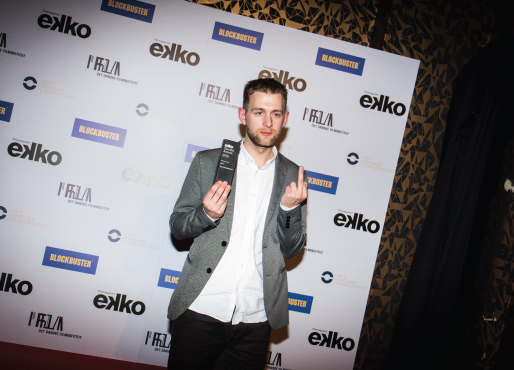 Theo Bat Schandorff viste stolt sin statuette – og langfinger – frem foran Ekkos fotograf efter at have vundet bedste dokumentar for det syrede dj-portræt Easy.