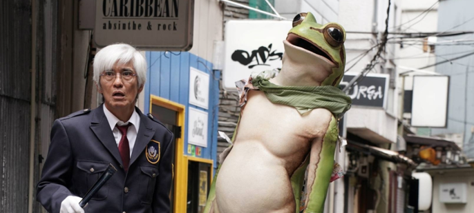 I den sidste del får Katagiri (Koichi Sato), en falleret bankmand anno 2025, besøg af en kæmpe frø, som insisterer på, at de sammen engang har reddet Tokyo fra en underjordisk orm (historierne griber her ind i hinanden). Her taler frøen med buddhistisk alvor, og musikken blæser op til storm.