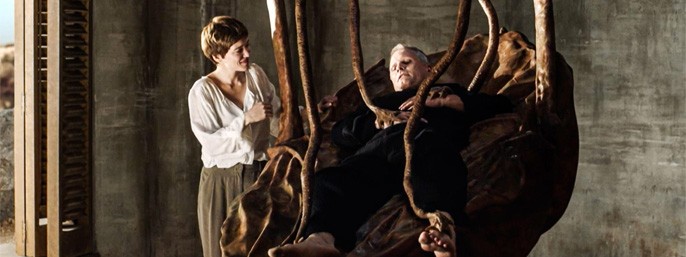 Med sit hvide hår, furede ansigt og sorte, kappelignende gevandter ligner han i glimt en dyster gyserskurk, måske en slags organvampyr. Han formår med små midler (særligt en enerverende hoste) at give sin karakter fysisk nærvær og stor melankoli.