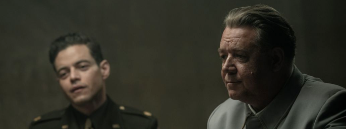 Det er en selvdestruktiv helt over for en manipulerende skurk, næsten karikeret ud i det Tintin’ske. Rami Maleks charmeflabede fjæs fungerer som spilopmager og tryllekunstner, mens Russell Crowe har taget på til rollen som Göring og spiller den narcissistiske og dog godmodige familiefar: fedladen, piblende og svedig.
