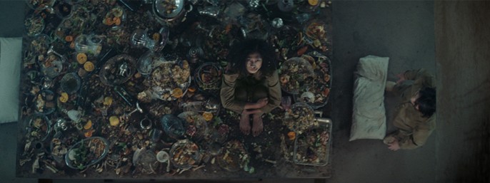 Mod slutningen konstaterer Goreng, at han kun kan få dem under sig til at rationere maden, fordi han ikke kan skide opad. En fin pointe, men det er den samme, som Trimagasi påpeger i starten, hvor han spytter på maden på vej nedad.