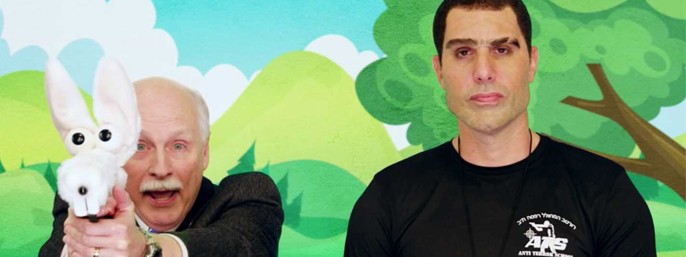 I et ti minutter langt segment er han forklædt som en fyrig israelsk sikkerhedsekspert, der rejser til våbenforkæmpernes hjerteland for at sælge en plan om at træne såkaldte Kinder Guardians: børnehavebørn, der skal lære at bruge håndvåben.