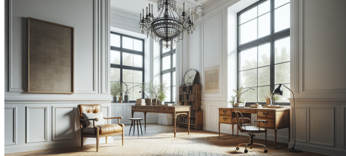 Et eksempel kunne være en minimalistisk stue med hvide vægge og store vinduer, der oplyses af en antik lysekrone og har et gammelt skrivebord stående i hjørnet.