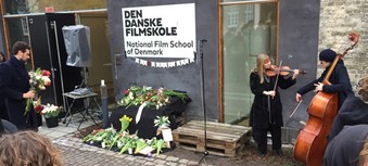 Mennesker fra den danske filmbranche mødte her til eftermiddag op til Filmskolens begravelse for at støtte elevernes kamp for at bevare deres uddannelse.