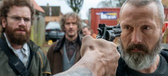 I kort teaser til Anders Thomas Jensens Retfærdighedens ryttere leverer Mads Mikkelsen en knytnæve i ansigtet på Nikolaj Lie Kaas, mens det fyger med sorthumoristiske replikker.