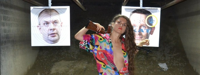 Her skyder rapperen Nikoline på billeder af danske politikere, som hun mener har smidt danskernes skattekroner væk, blandt andet til kriminelle banker.